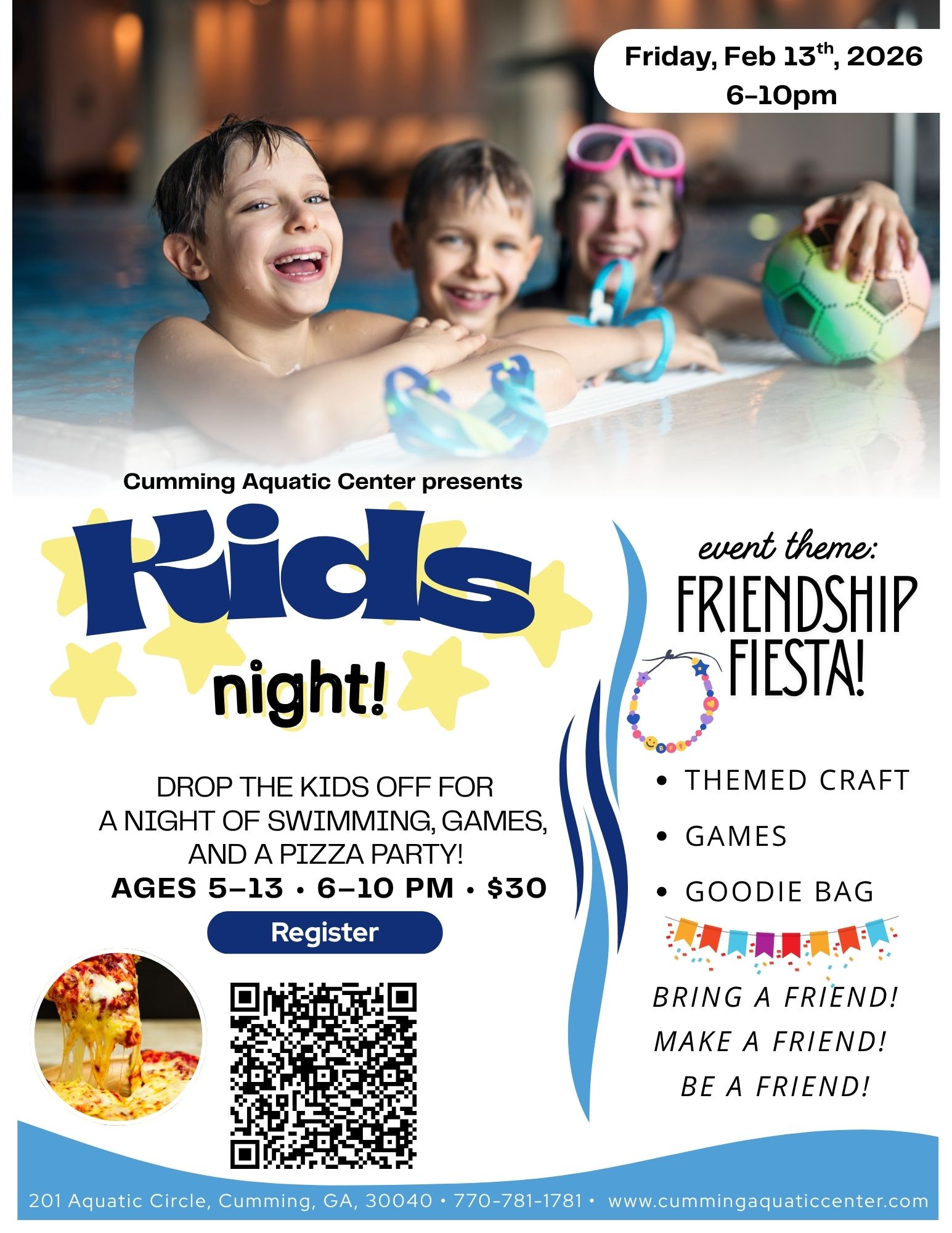 It’s Kids Night at the Pool! Children ages 5–13 are invited for an evening of supervised swimming, a themed craft, and a pizza party. Each Kids Night features a special theme, complete with a craft and a small goodie to take home!
